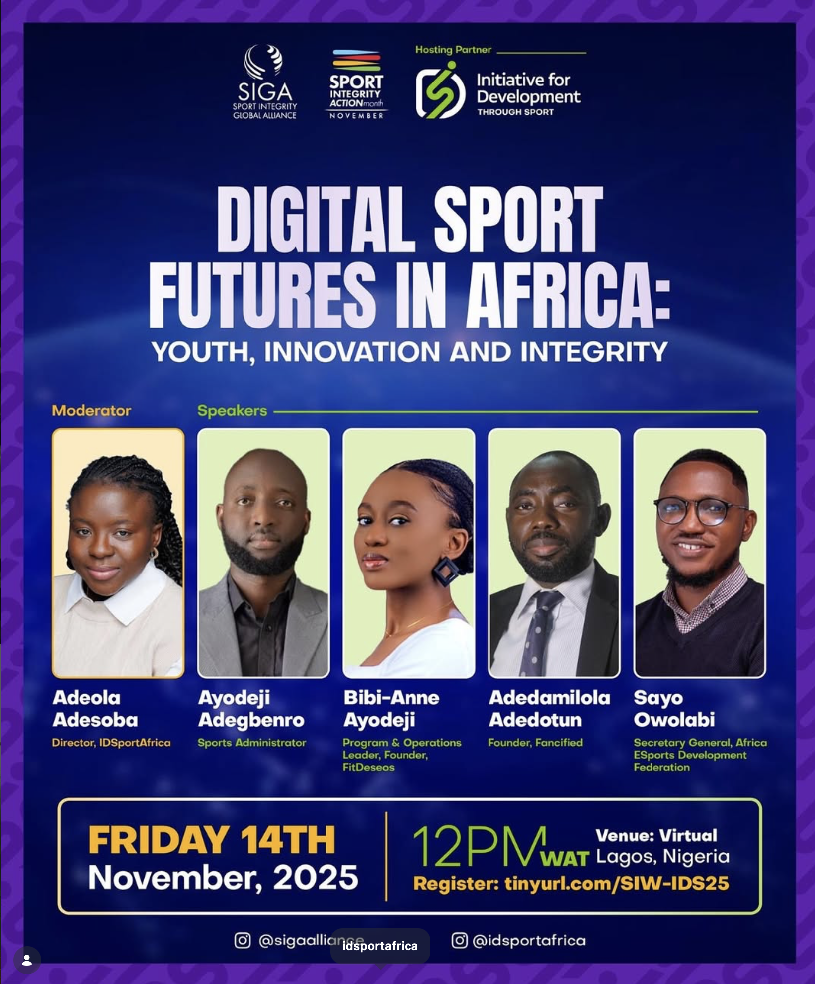 We joined the global celebration of #sportintegrityactionmonth with our event Digital Sport Futures in Africa: Youth, Innovation & Integrity. From grassroots to global — we spotlighted how African youth and technology are shaping the future of sport with integrity at its core. organized by Sport Integrity Global Alliance and hosted by Initiative For Development through Sport(fka SPYD). The conversation focused on digital transformation in sports governance across Africa with panelists discussing how technology is shaping grassroots sports and athlete development. The discussion also explored various aspects of digital innovation in sports, including fan engagement platforms, esports development, and the importance of safeguarding young athletes in the digital age. For the future of African sports to be secured, there is the need for integrity, innovation, and strategic partnerships to drive growth in the digital sports landscape.